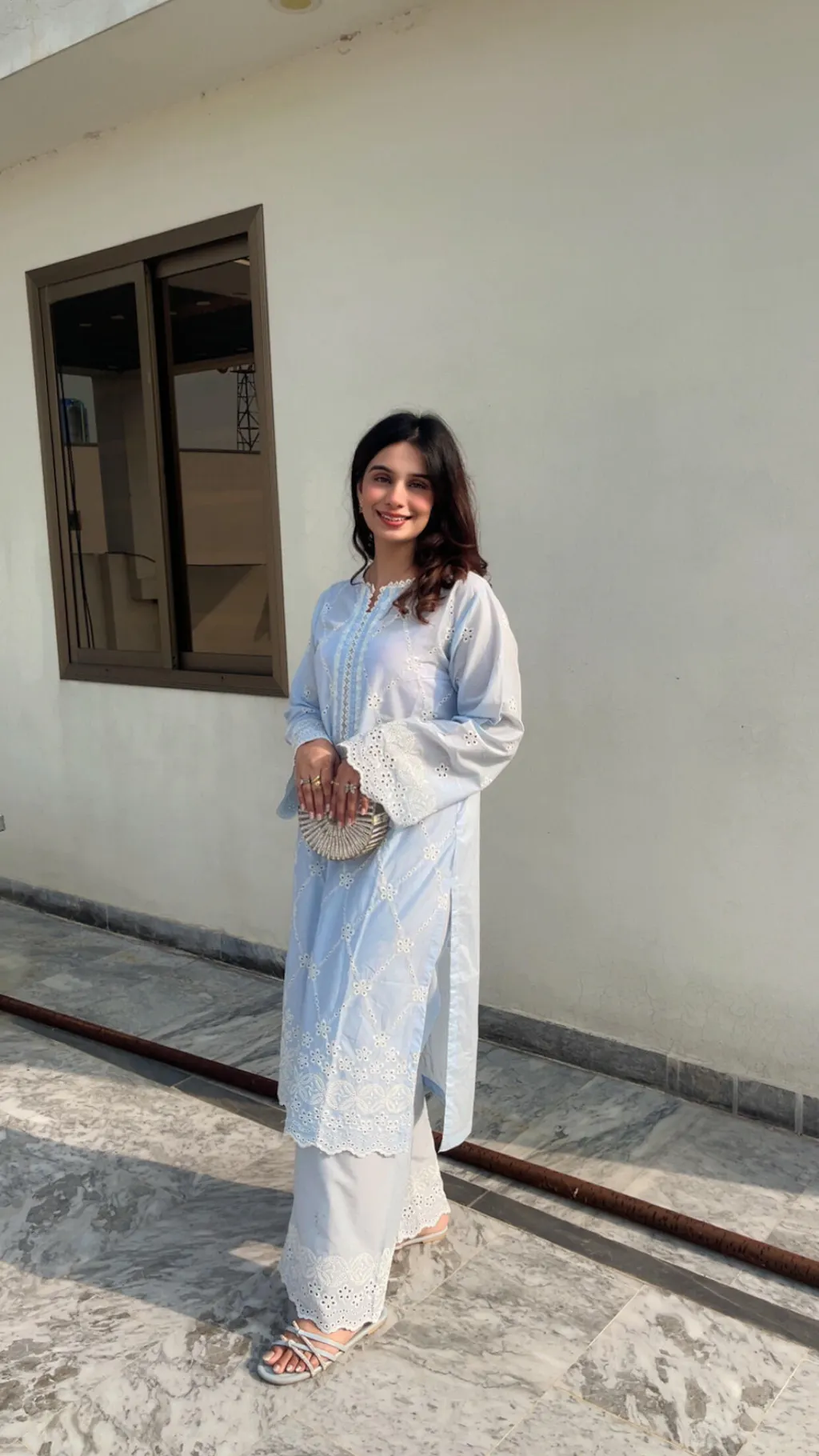 This blue cotton set has embroidery all over it. The shirt has lace details around the neck. It comes with a matching pair of pants with schiffli embroidery on the edges.